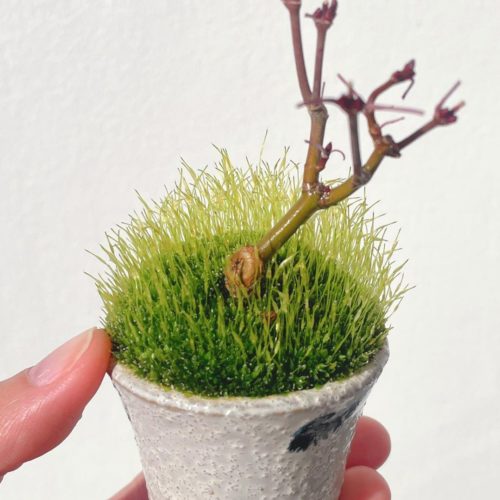 オリヒメモミジに貼っていた苔が、この寒い季節にも関わらずニョキニョキボーボーになってきたので、これは…